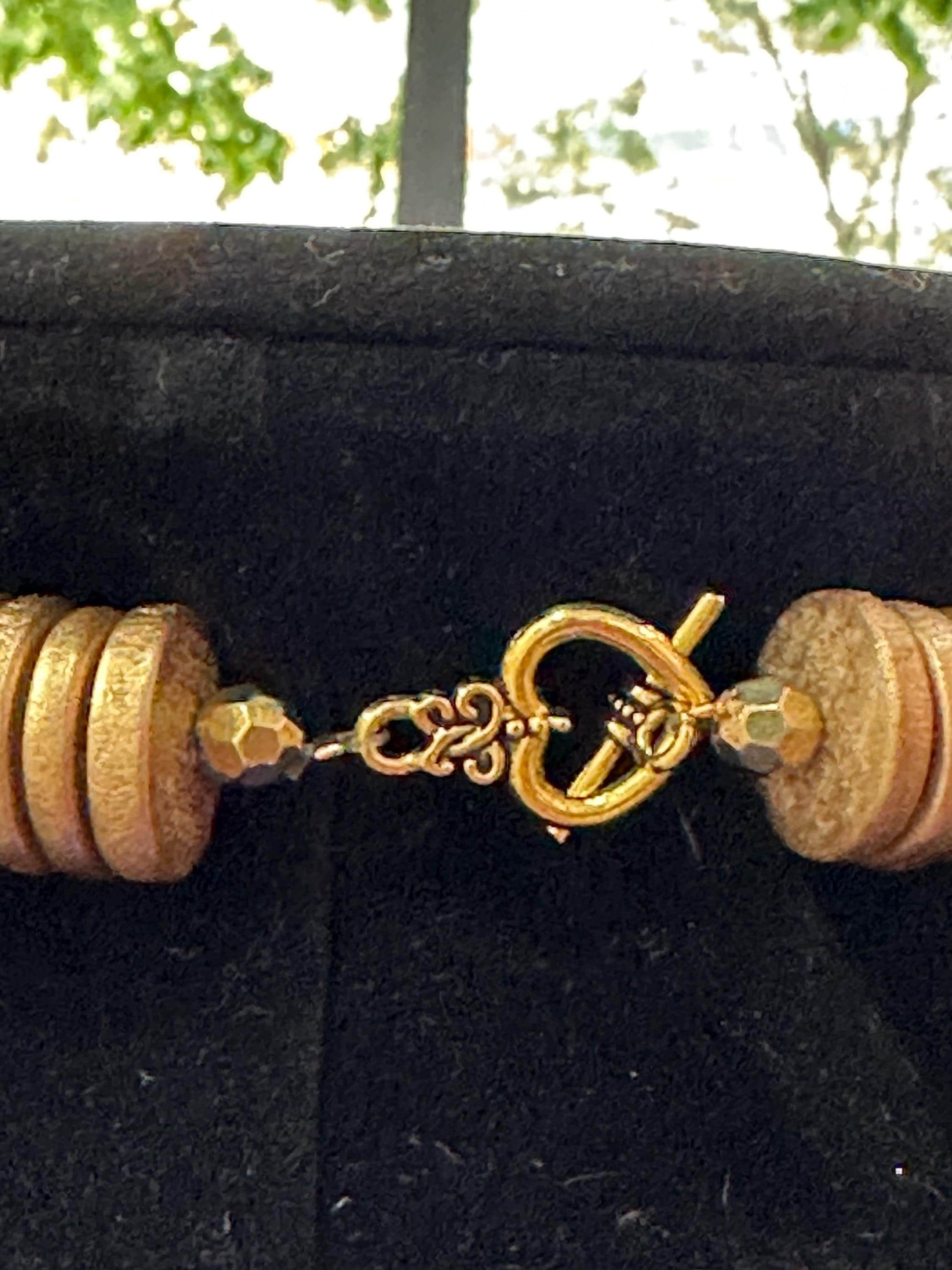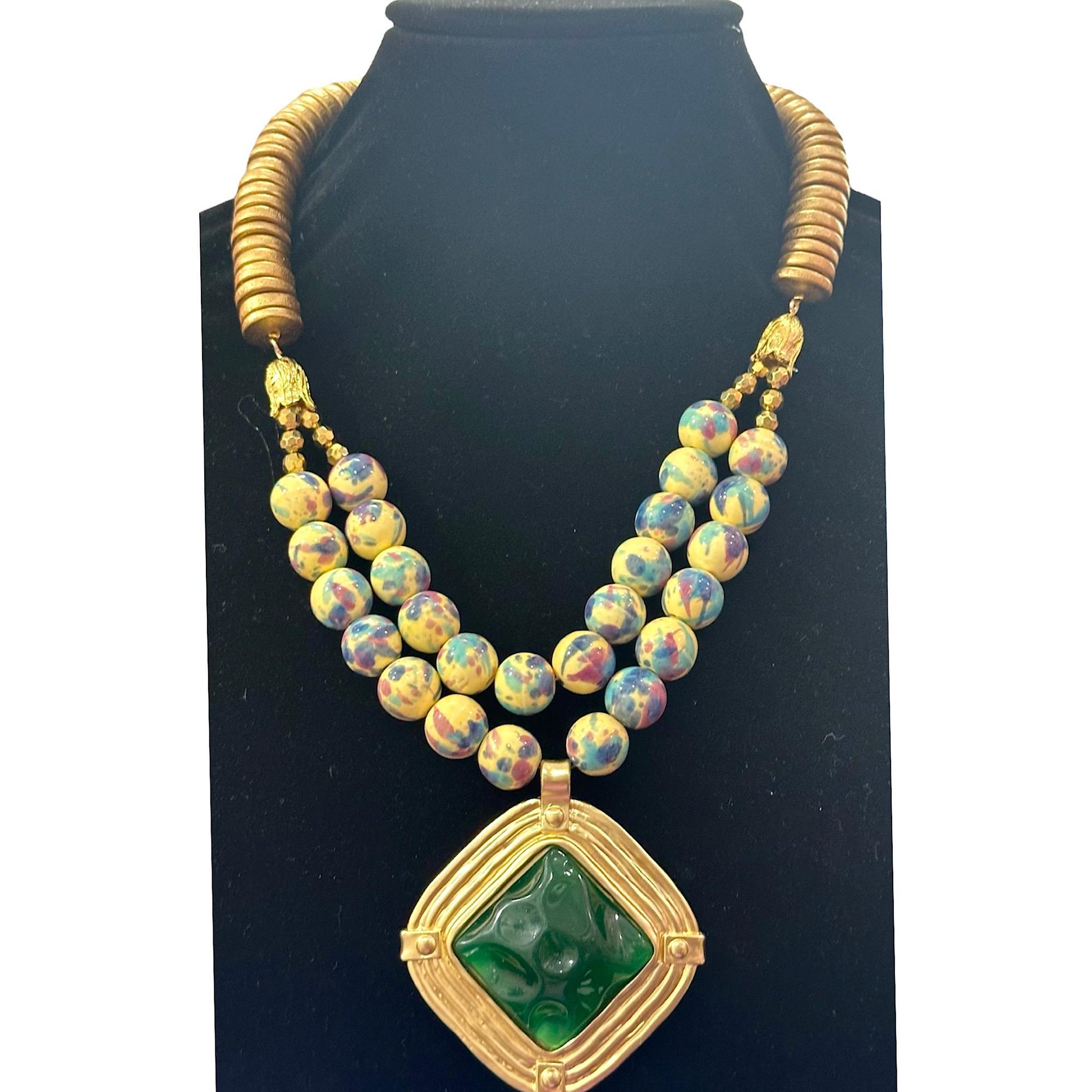 Add bold energy to your outfit with this vibrant, handcrafted statement necklace. Featuring a double strand of multicolored speckled ceramic beads, gold-toned tribal coconut shell beads, and a stunning sculpted green pendant, this piece is made to stand out. Handmade by Risha, this one-of-a-kind necklace blends artistic expression with timeless power. Whether you’re styling it with a sleek dress or a casual tee, it’s designed to make you feel seen, confident, and radiant.