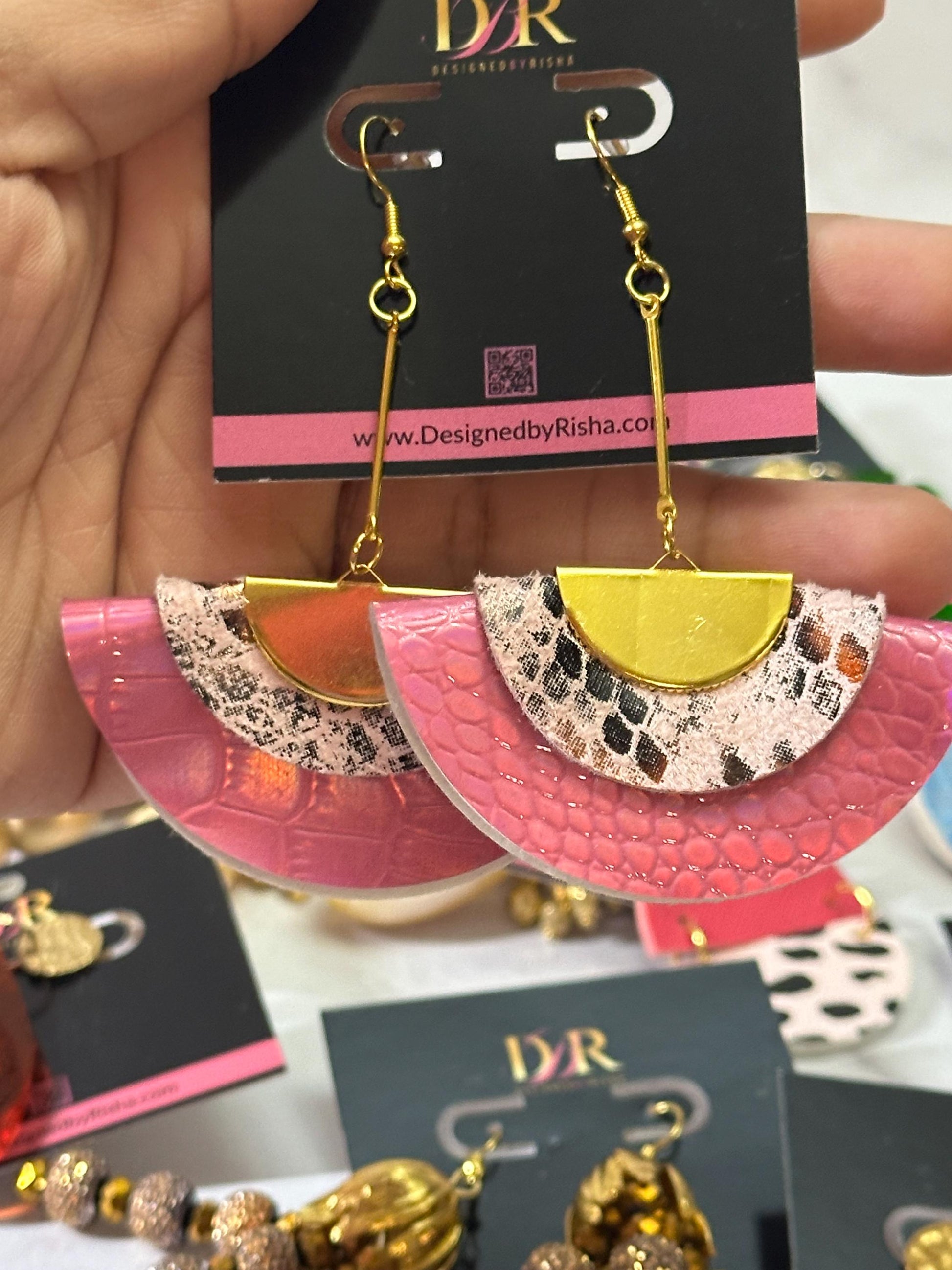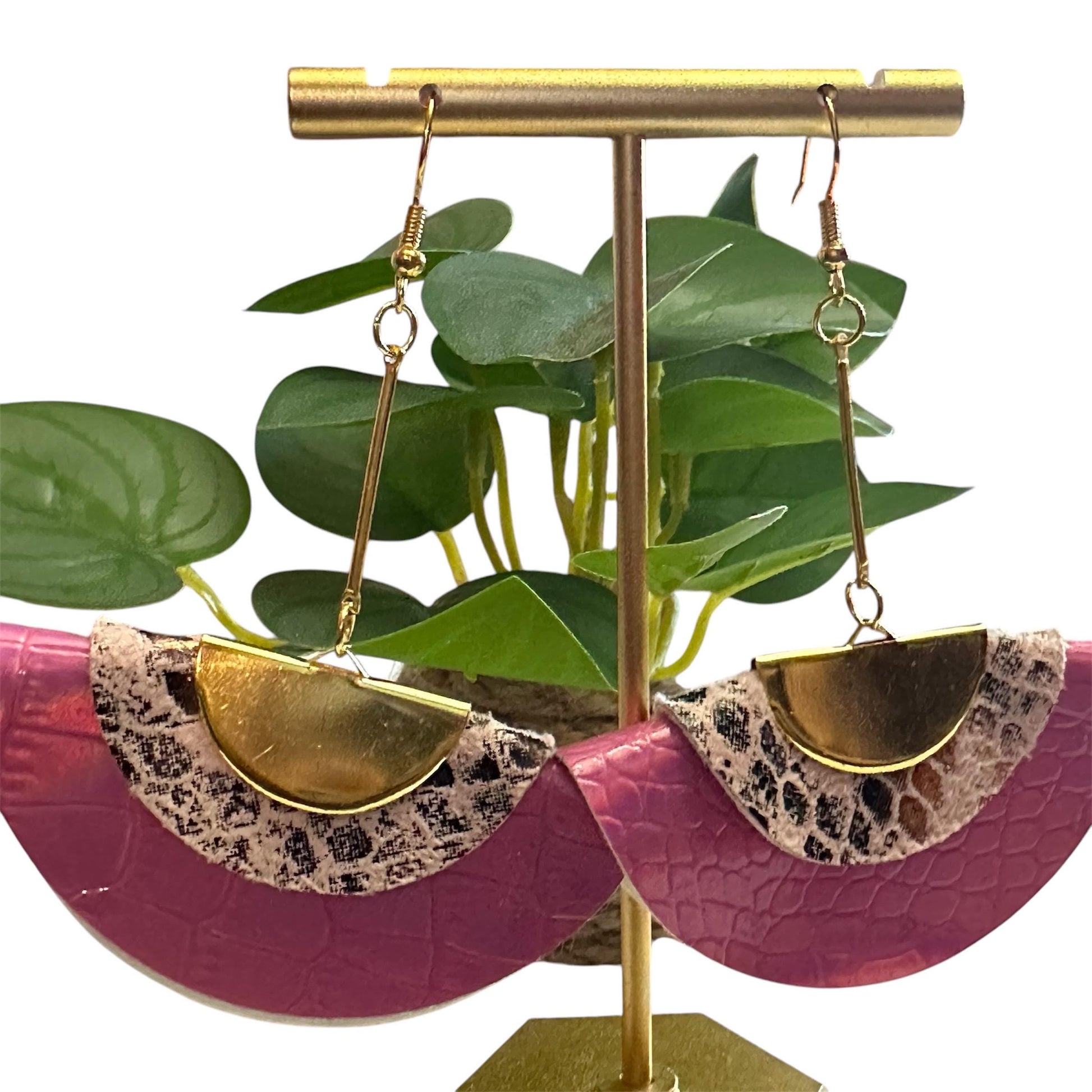 Turn heads this summer with these bold, handmade faux leather earrings featuring a chic blend of pink crocodile embossing, snakeskin print, and sleek gold-tone hardware. The unique half-moon silhouette adds drama and elegance, while the lightweight design makes them perfect for all-day wear — from beach brunches to rooftop evenings. Each pair is handcrafted with attention to detail, combining statement style with easy comfort. Whether you're shopping for yourself or looking for a one-of-a-kind gift, these trendy earrings bring a modern, fashion-forward edge to any summer outfit.