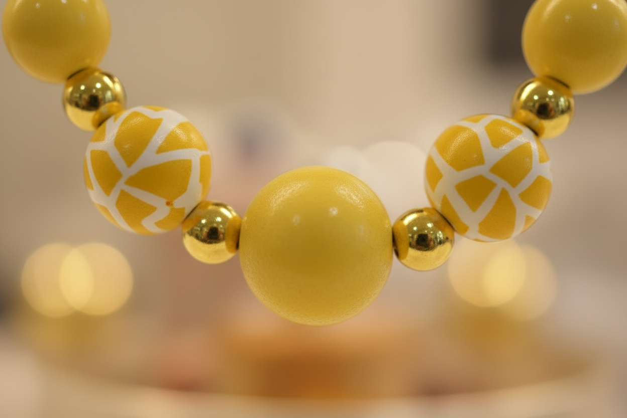 Handmade Acrylic Bead with Long Sparkly Pendant Bring sunshine to your style with this bold yellow statement necklace set, handmade in NYC! Featuring smooth round beads, shimmering gold spacers, and a unique cluster pendant adorned with iridescent crystals, faux pearls, and a sparkling flower charm — this eye-catching piece is sure to turn heads. Comes with matching small yellow beaded earrings for a complete look.