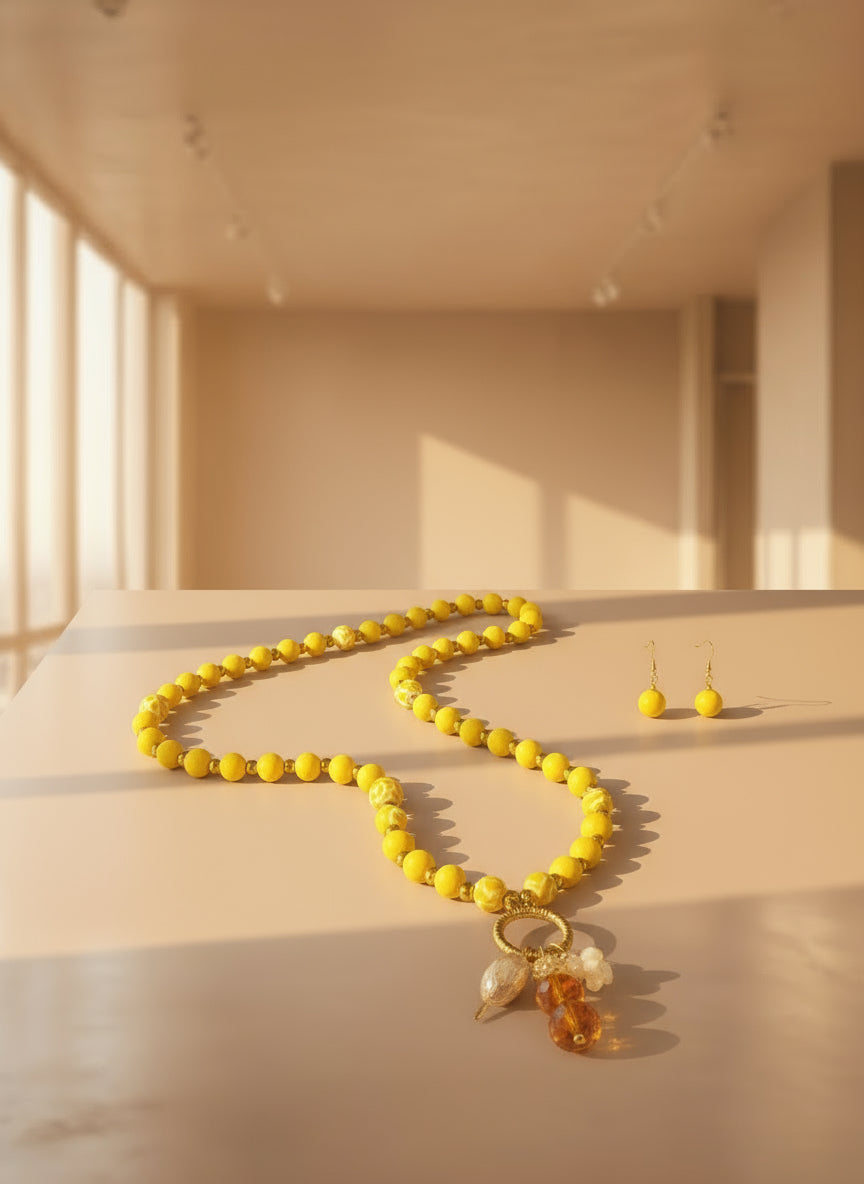 Long Yellow Beaded Necklace Set: Wire-wrapped Pendant